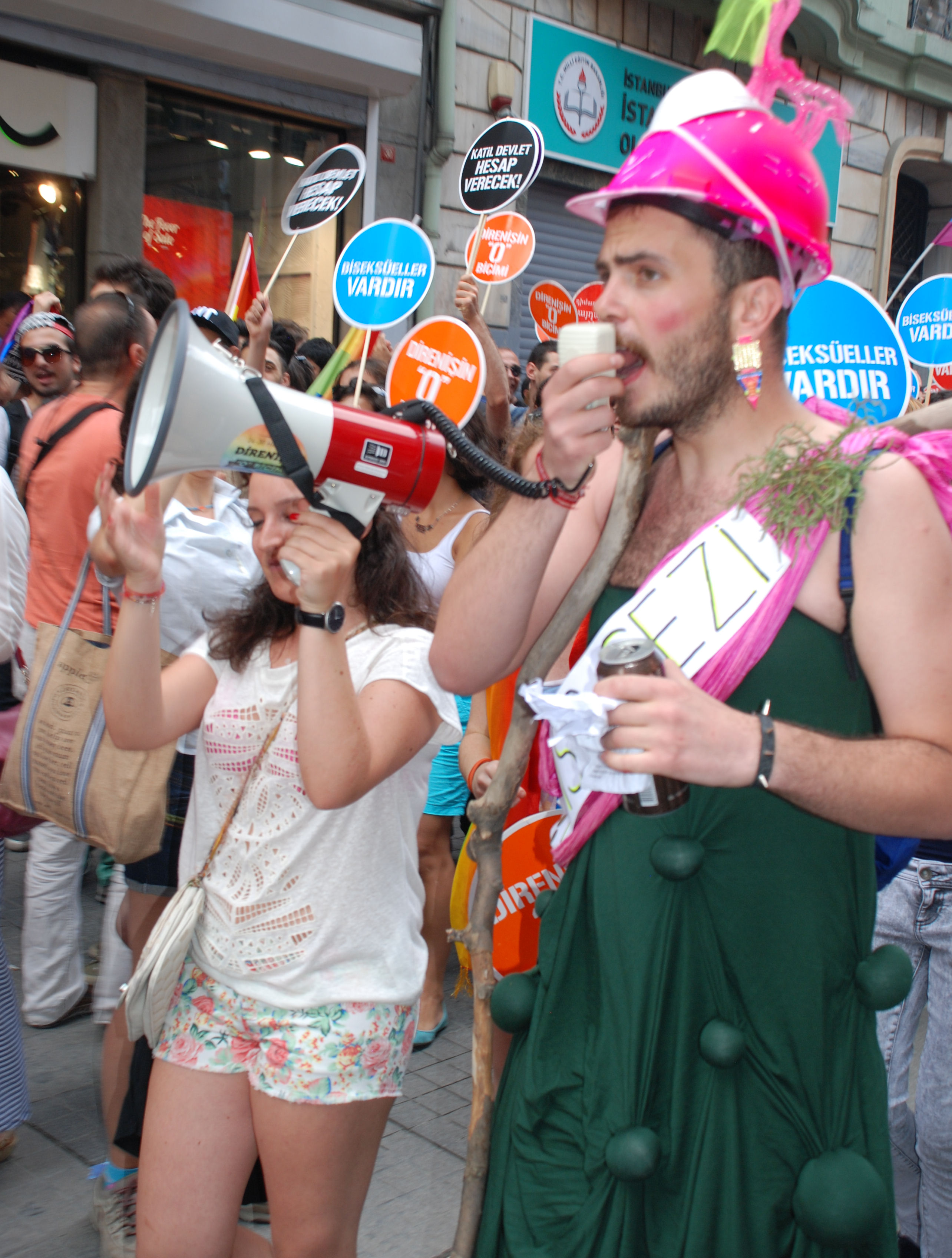 Kıyafetlere gelince herkes yaratıcılığını konuşturuyordu. Olmazsa olmaz aksesuarlar gökkuşağı bayrakları ve LGBTT’nin hazırlamış olduğu pankartlardı.